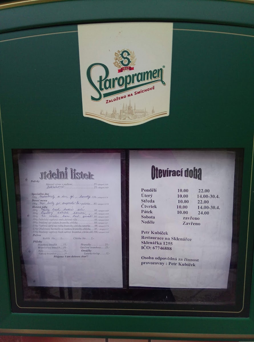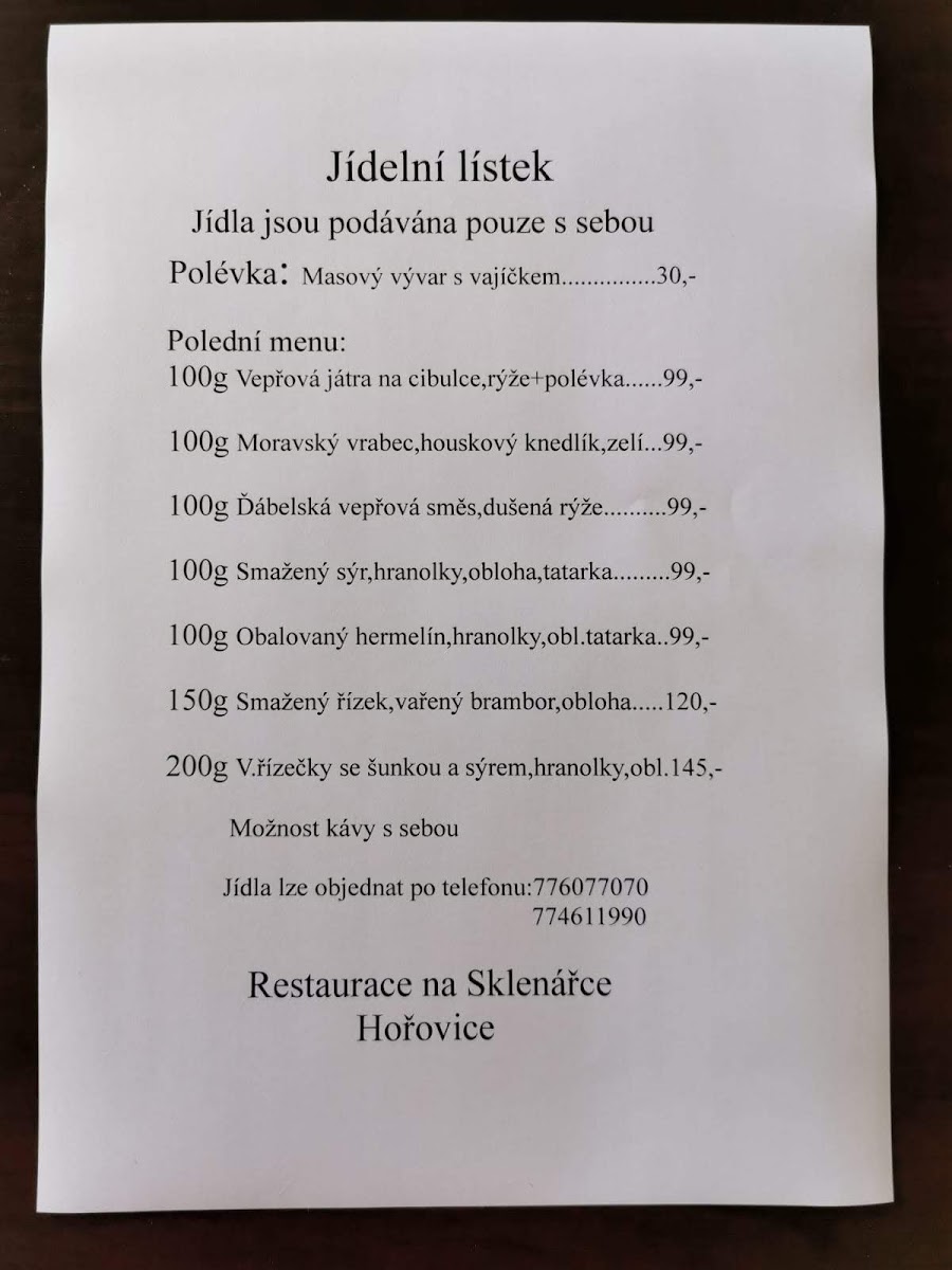 Restaurace Na Sklenářce Menu
